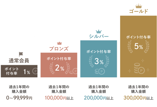獲得したポイントは1ポイント=1円として、次回のお買い物よりご利用いただけます。最終購入日より過去1年間の購入金額に応じてランクが決まり、ポイントの付与率が変動します。