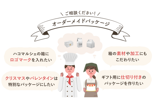 だったら、お店とお菓子にピッタリの、ハコと飾りもあったらいいな。