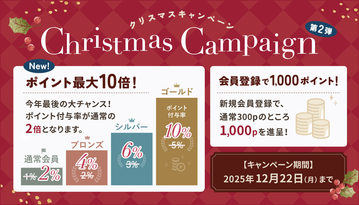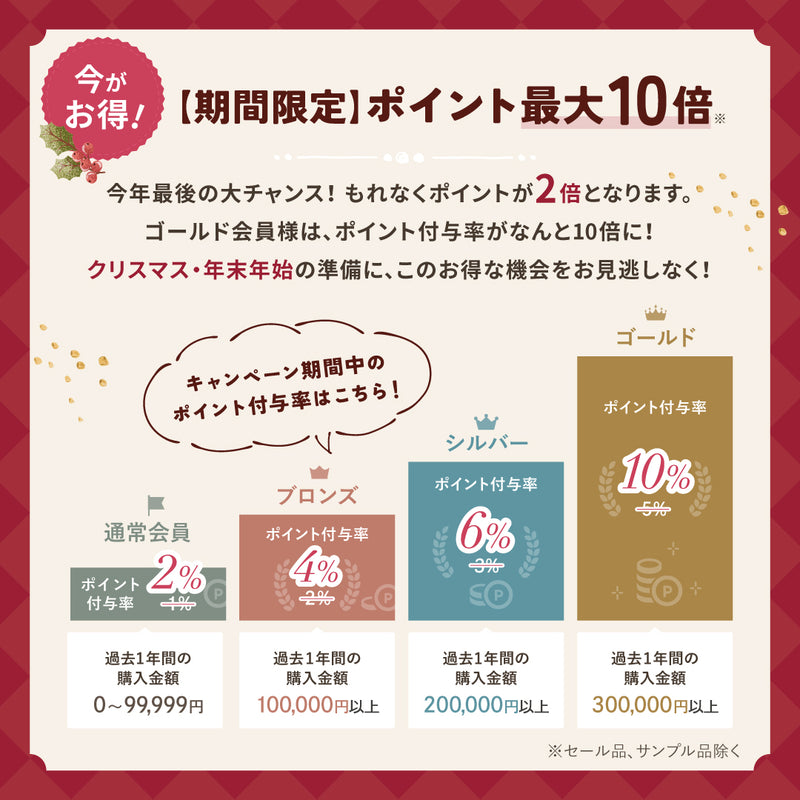 獲得したポイントは1ポイント=1円として、次回のお買い物よりご利用いただけます。最終購入日より過去1年間の購入金額に応じてランクが決まり、ポイントの付与率が変動します。