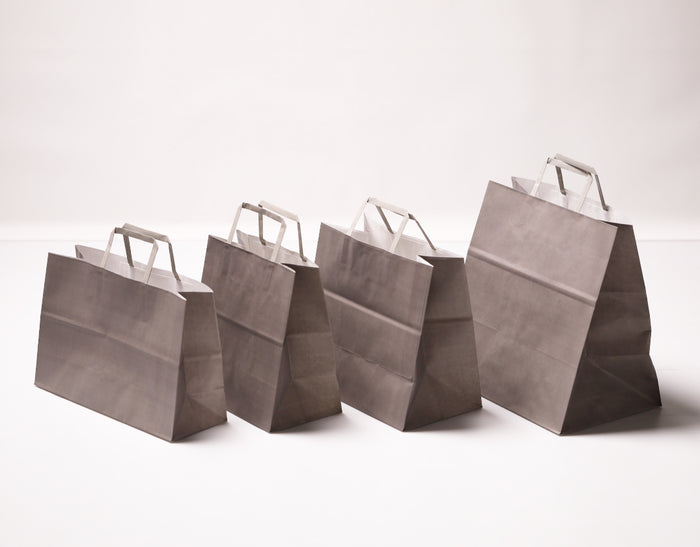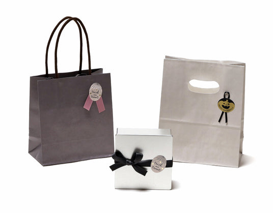お配り用のプチギフトからホールケーキまで手提げ袋もグレーにしてイメージを統一◎