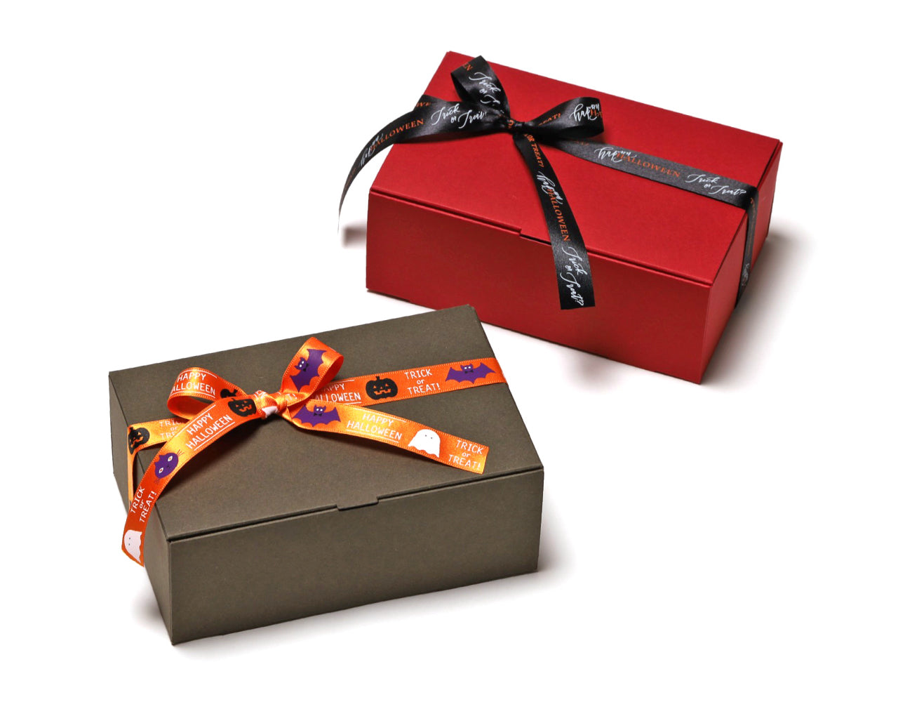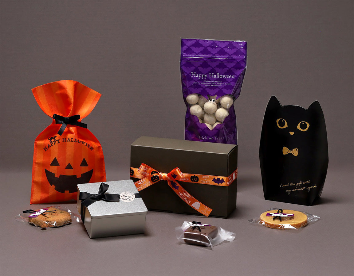 ピリッと明るいオレンジカラーは店内を楽しく演出します。いつものギフトボックスに結ぶだけでハロウィンラッピングが楽しめます。袋のラッピングにもおすすめです。