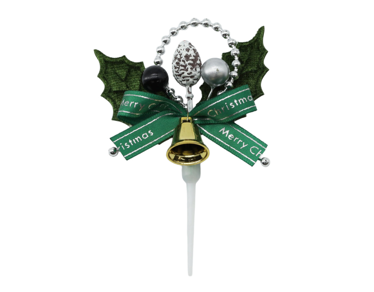 アーティシャルフラワーを使用し、クリスマスの定番 松ぼっくりやロゴ入りリボンなど丁寧なつくりのケーキピック。