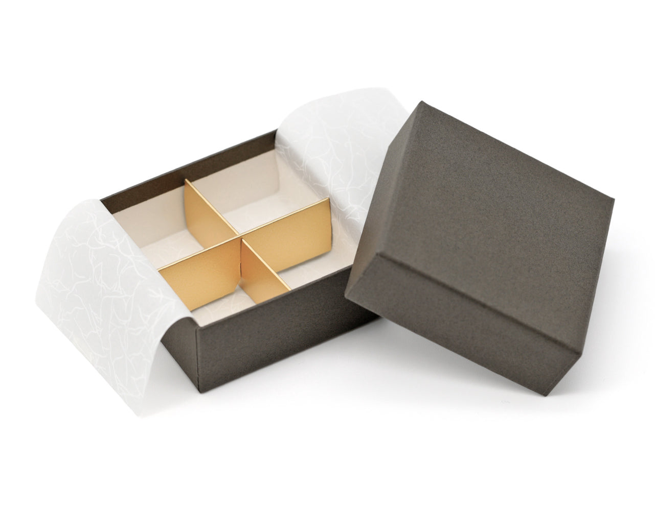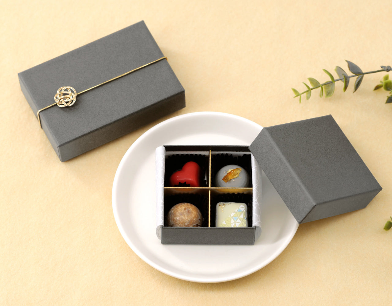 大人っぽく落ち着きあるシックなカラーは、小さくても高級感が演出できます。35mmマスにトリュフやボンボンショコラが4つ入ります。