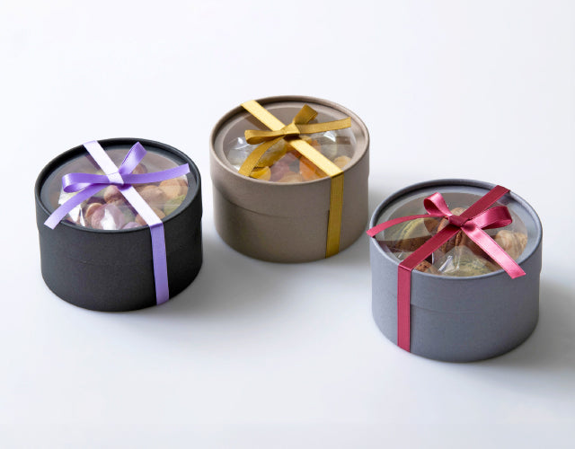コロッとした形の蓋身式の箱で 中身が見えるので華やかさがあり、お菓子や小さい雑貨などのプチギフトにもおすすめです。